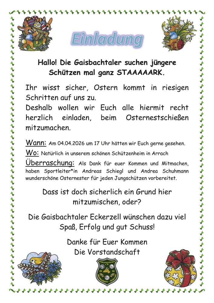 Einladung Osternestschießen für die jüngeren Schützen